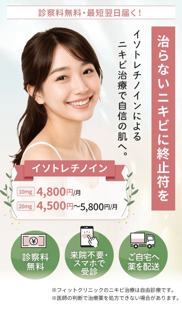 フィットクリニックは、イソトレチノインをオンラインで処方してもらえるクリニックの一つです。診察料が無料で、送料も比較的安いため、トータル費用を抑えやすいのが特徴です。