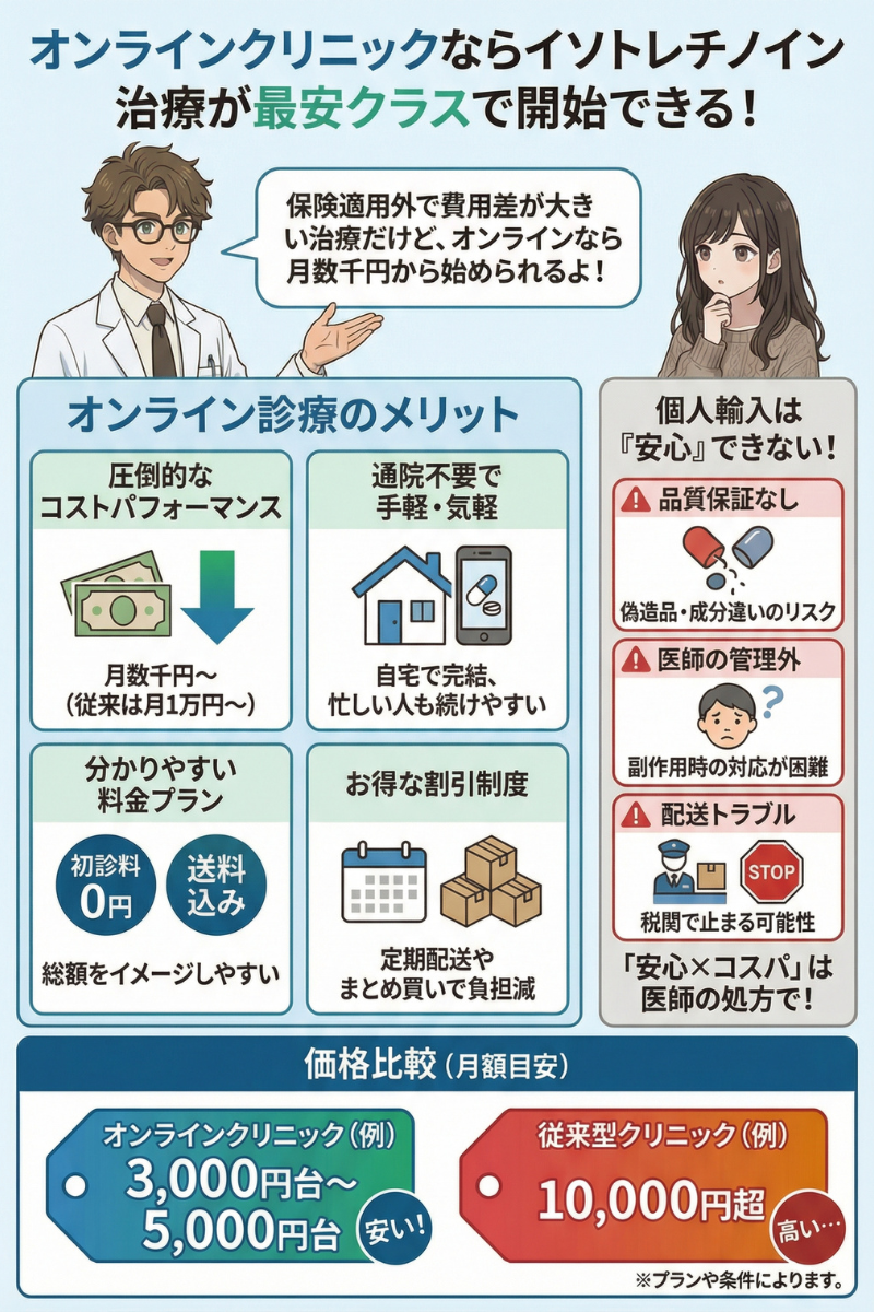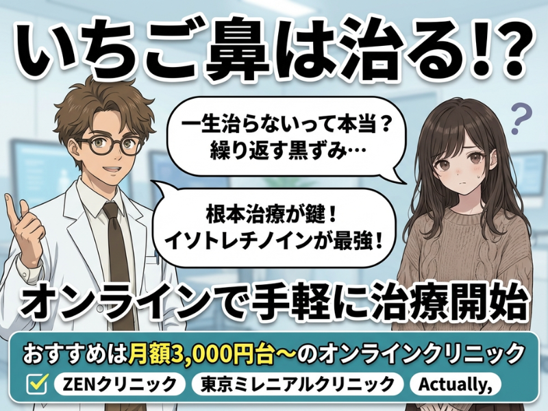 いちご鼻の原因が皮脂・角栓タイプなら、イソトレチノインは選択肢になり得ます。そのうえで、費用と続けやすさを両立したい人は、オンライン診療を活用するとハードルが下がります。