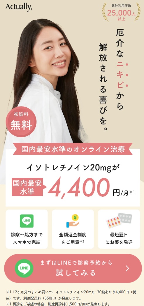 Actually,(アクチュアリー)は、オンライン診療の中でも価格が抑えめなプランがあることで知られています。ニキビ治療だけでなく、医療ダイエットやAGAなど複数の診療メニューを扱っているのも特徴です。