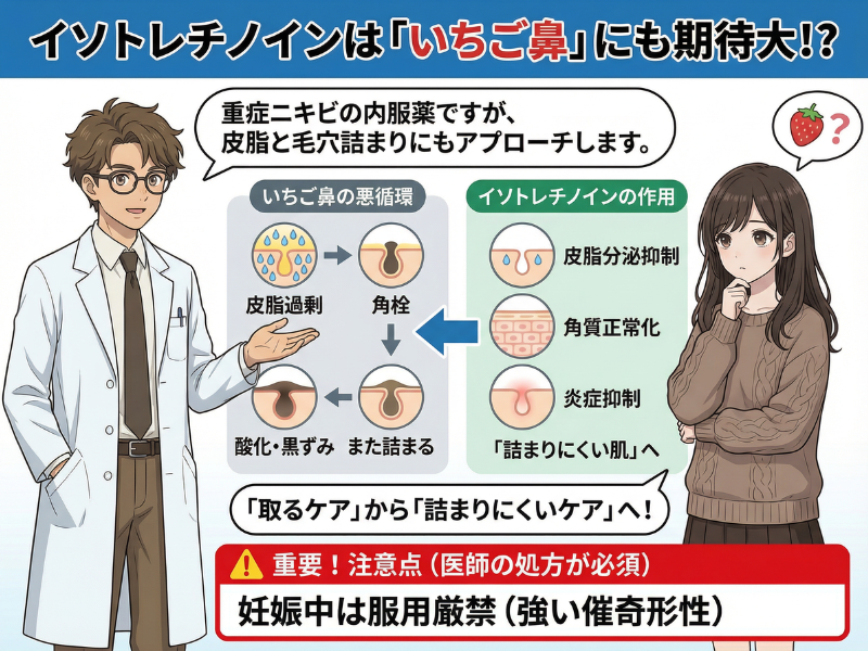 いちご鼻はタイプが混ざっていることもあります。自分で判断が難しいときは、皮膚科で毛穴の状態を見てもらうのがおすすめです。医師なら「イソトレチノインが合いそうか」「別の治療が良さそうか」を含めて提案してくれます。
