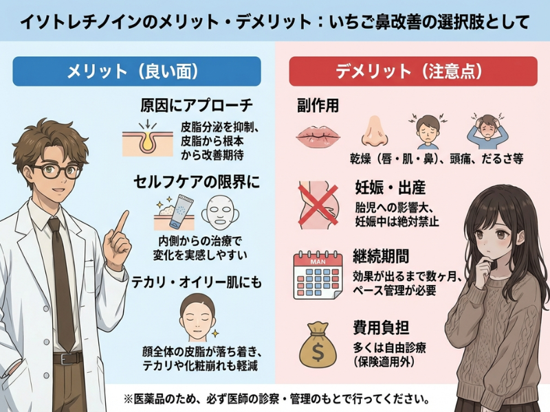 いちご鼻改善の「選択肢のひとつ」として注目されるイソトレチノインですが、作用が強い分、良い面と注意点の両方があります。始める前にメリット・デメリットを整理しておきましょう。※医薬品のため、使用は必ず医師の診察・管理のもとで行ってください。