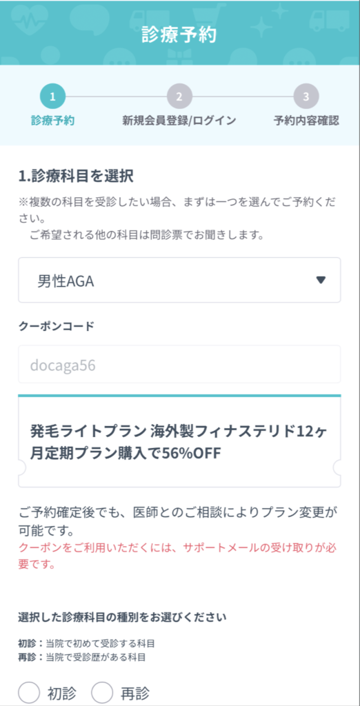 診療科目を選択する画面で、クーポンコードが自動で適応されます。